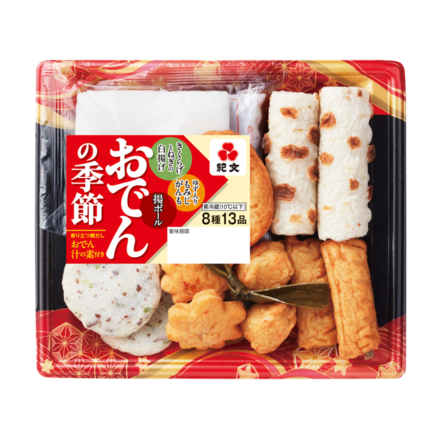 きくらげとねぎの白揚げやゆず入りもみじがんもなどが入った、8種13品のおでん種ものセットです。