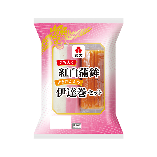ぐち入りの紅白蒲鉾と甘さひかえめの伊達巻をセットにしました。