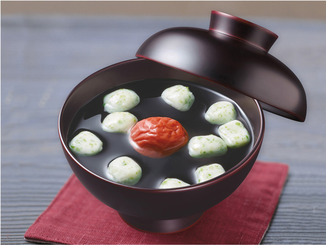 はんぺんあられ磯のふんわりとした食感と、磯の香りが優しいお吸い物です。梅の酸味で、すっきりとした後味になっています。